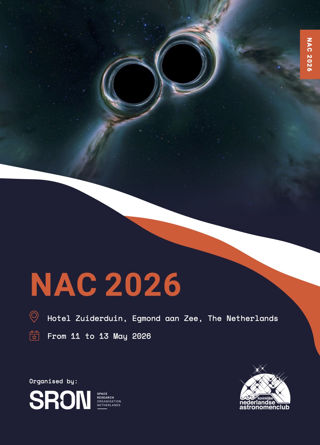 The Netherlands Astronomy Conference 2026 will take place in Egmond aan Zee in Hotel Zuiderduin from May 11 to May 13. It will be organized by SRON.